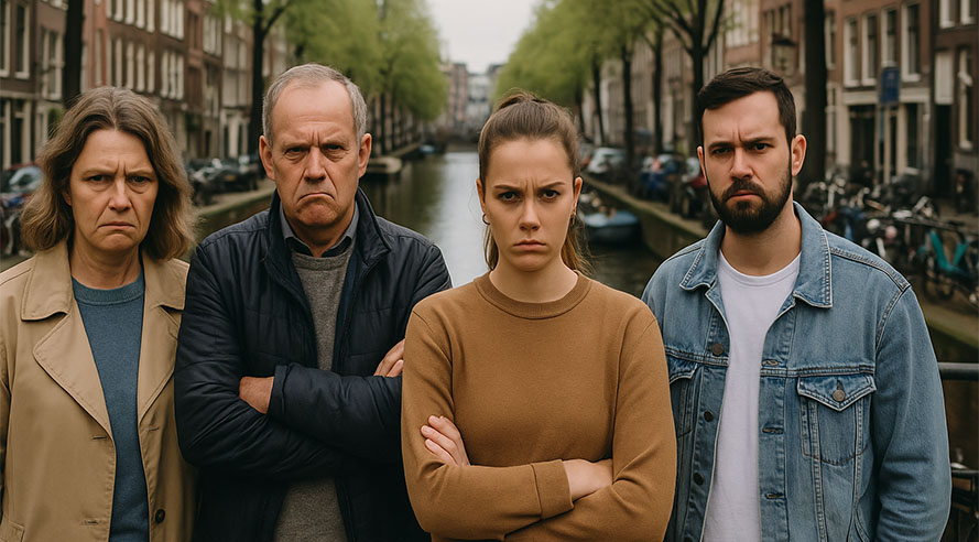 ‘Het zal mij niet verbazen als het zo is, als ik naar mezelf kijk tenminste: nors kijkend, chagrijnig en bot. Dat zijn vooral oudere Amsterdammers. En zo zie ik veel mensen om me heen. Of ze zijn hondsbrutaal, egocentrisch en onbeschoft. En dat zijn vooral onze jongere generatie Amsterdammers.’
