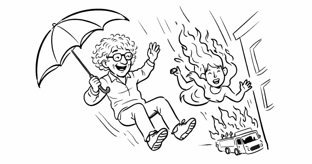 Het ene blondje ziet een hele grote paraplu staan en krijgt een helder idee. Ze pakt die paraplu, slaat het raam eruit, duwt de paraplu open en springt naar beneden. Ze komt redelijk beneden.