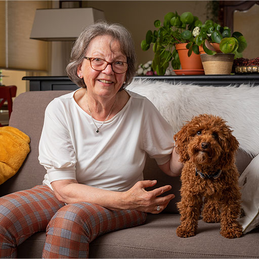 Ook OOPOEH Marja (73) geniet volop van haar match met krullenbol Koosje. Marja: ‘Het is ongelofelijk hoeveel liefde zo’n hondje brengt. Ik geniet echt van elk moment. Bijvoorbeeld als Koosje tegen mij aangerold op de bank ligt te slapen. Heerlijk is dat!’