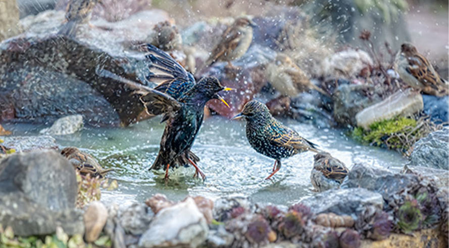 Voor vissen is een mini vijver eigenlijk altijd te klein, maar geen vissen betekent geen dode vijver! Libellen en waterkevers komen op water af, vogels komen badderen, bijen en andere insecten komen drinken en met een beetje geluk trek je ook een kikkertje of watersalamander. Zorg dat je hierop voorbereid bent en maak een opstapje of loopplank voor deze amfibieën in én naast je vijver, zodat ze er in en uit kunnen klimmen. Vogels zijn blij met een badplaats van ongeveer 2 centimeter diep.