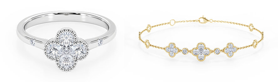 De sieraden die onderdeel uitmaken van de Garden collectie hebben allemaal een herkenbare bloemvorm met briljant geslepen diamanten als vier kroonbladeren. Het hart van de bloem bestaat uit een vierkante, ofwel ‘princess’ geslepen diamant. De diamanten zijn gezet in een milgrain bezelzetting, waarbij de diamant wordt omsloten door een dunne gouden band. Boven op de band is een delicate kralentextuur toegevoegd. Een bezelzetting is een van de meest veilige diamantzettingen en ideaal voor sieraden die dagelijks gedragen worden. De collectie bestaat uit ringen, kettingen, oorbellen en armbanden. Alle sieraden zijn vervaardigd uit 18 karaat goud en verkrijgbaar in zowel geelgoud als witgoud.