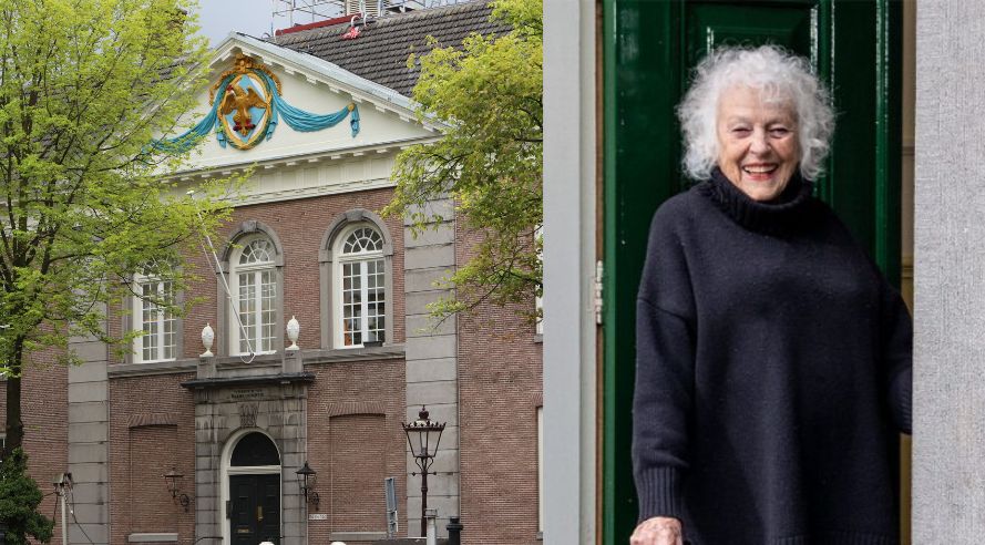 Mijn aandacht werd deze keer getrokken door de foto van een vrouw die zich bevond bij het timpaan op het dak boven de ingang van de Hof. Wat deed deze dame daar hoog in de lucht?