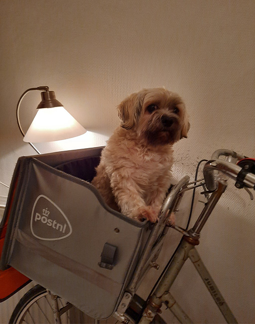 Dit is mijn kanjer Fluffy in mijn PostNL fietstas. Ik ben zelf postbezorger en had ‘m er effe ingezet als mascotte!