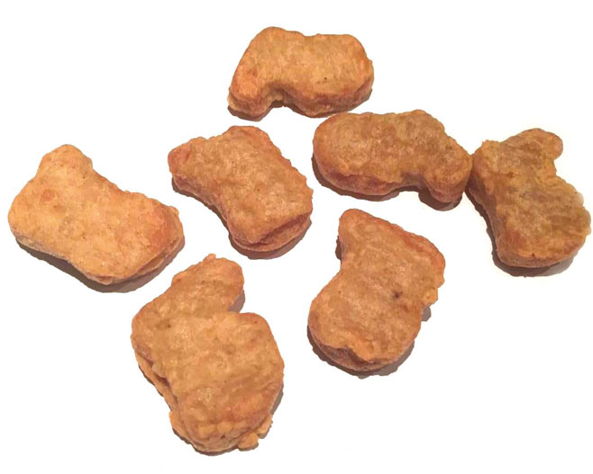 Oordeel: Nuggy kip lekker, tok of the town’, staat er op de verpakking, maar deze taaie en smaakloze kiprakkers scoren een nipte voldoende.