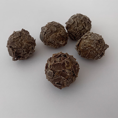 Oordeel: Zeg je chocoladetruffels, dan voldoet de vorm van deze exemplaren aan je verwachting. De pure, ge-cacao-poederde omhelzing in combinatie met de slagroomvulling vormen een complete bite. Alles klopt, dit is een typisch gevalletje van ‘smullen met je ogen dicht’.