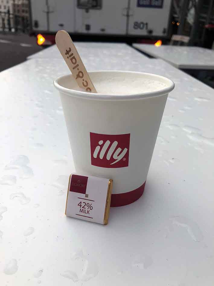 Oordeel: ‘Goed roeren, dan wordt het vanzelf chocolademelk’. Ah, dat wordt een kop hete melk met een choc-o-lait stick erin. Zoet, slap en fantasieloos. We krijgen er wel een heerlijk Domori 42% chocolaatje bij.
